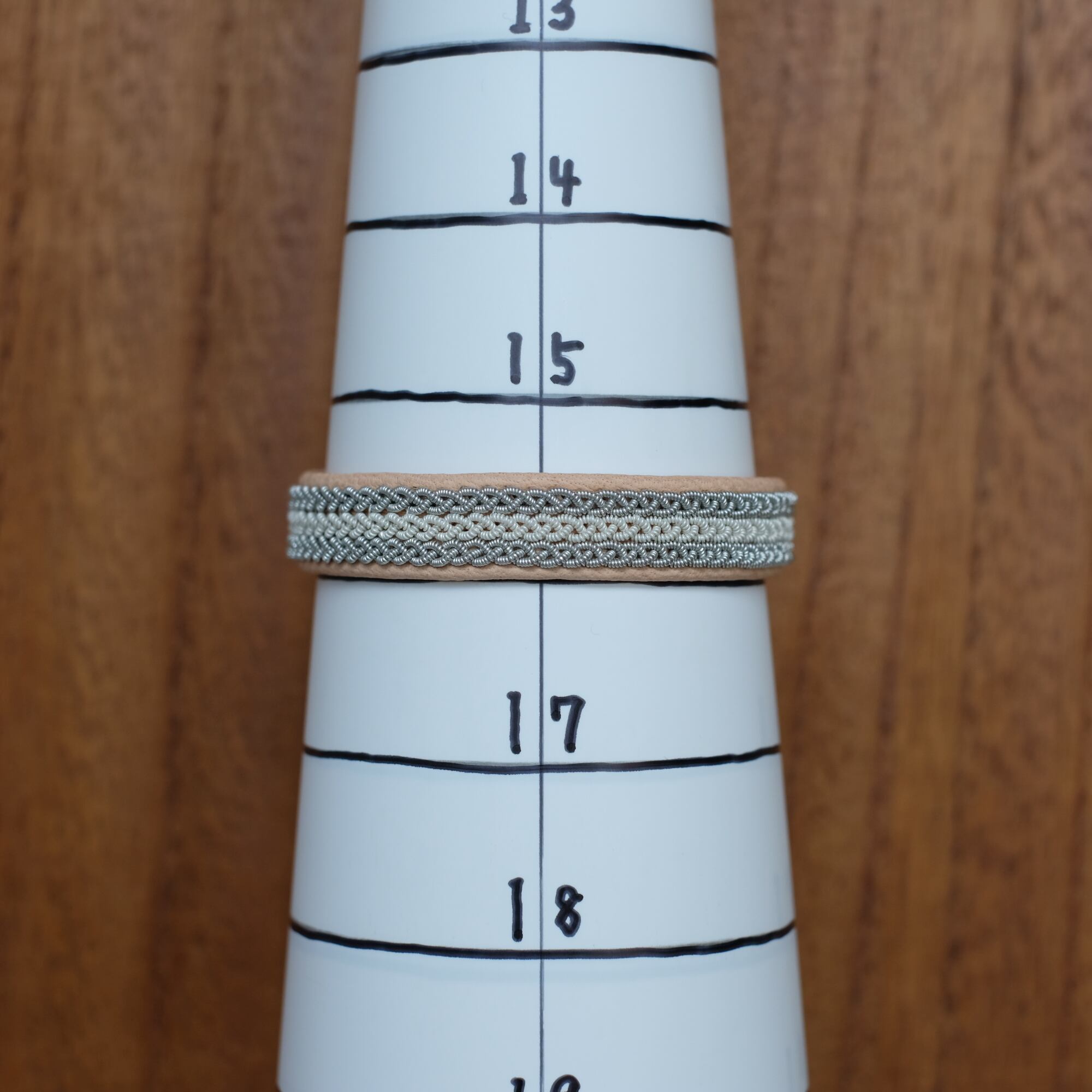 ラップランド地方の北方民族サーミの伝統工芸であるピューターワイヤー刺繍を用いてブレスレットを作りました。本場のサーミブレスレットはトナカイの革と角を使って作りますが、蝦夷鹿が大好きなので蝦夷鹿の革と角を使っています。